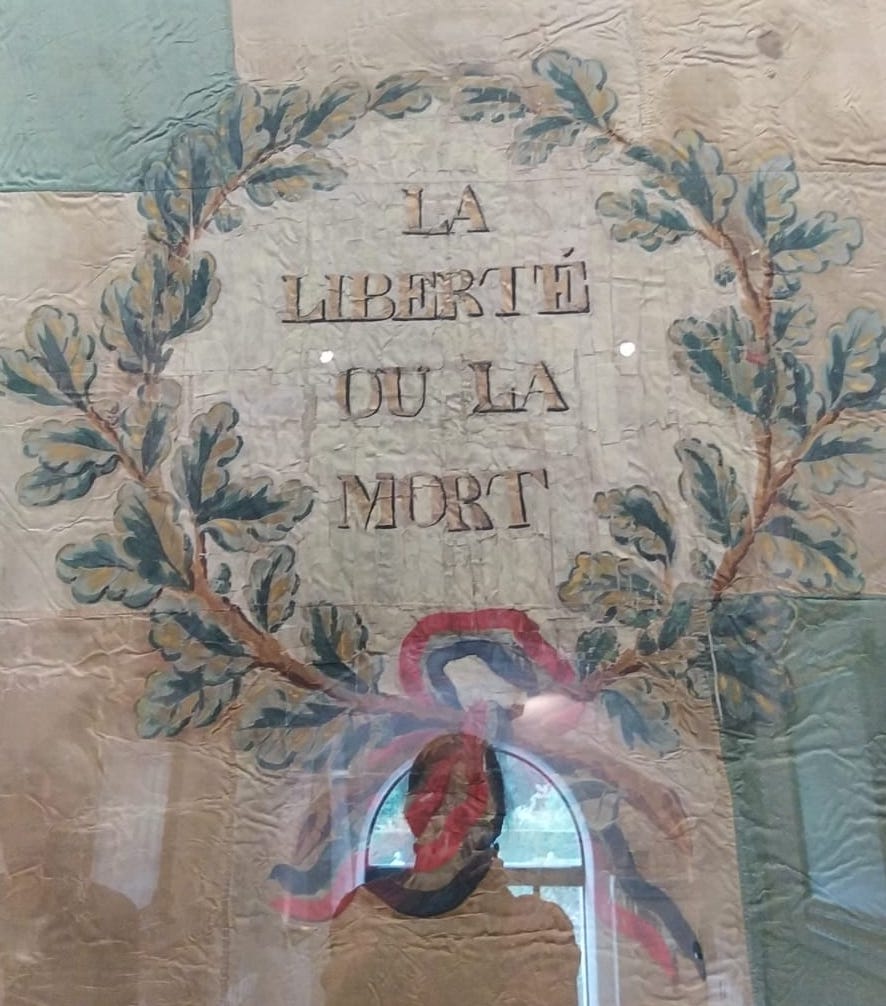 Quant à la photo ci-dessus, un exemple du “rien à voir avec le médiéval” : une photo prise dans le musée de la Révolution au château de Vizille. Cette tenture est bien le genre de chose improbable que je voudrais réussir à adapter en forme de tatouage, par exemple. C’est là un des aspects intéressants du médium qu’est la peau : il faut tenir compte du fait qu’un tatouage ne peut pas être un simple copié collé de n’importe quel dessin ou motif, il faut prendre en compte l’évolution de la peau dans le temps, et des encres. Et c’est un défi motivant !